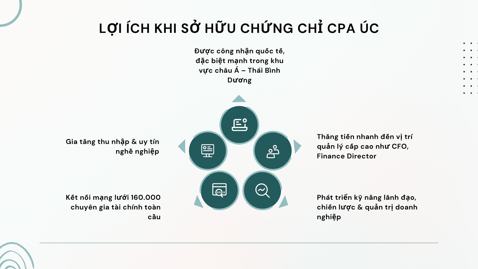 Không chỉ giúp bạn nâng cao kiến thức chuyên môn, CPA Úc còn mở ra cơ hội làm việc, định cư và thăng tiến trong các tập đoàn đa quốc gia tại hơn 118 quốc gia, trong đó có Việt Nam.