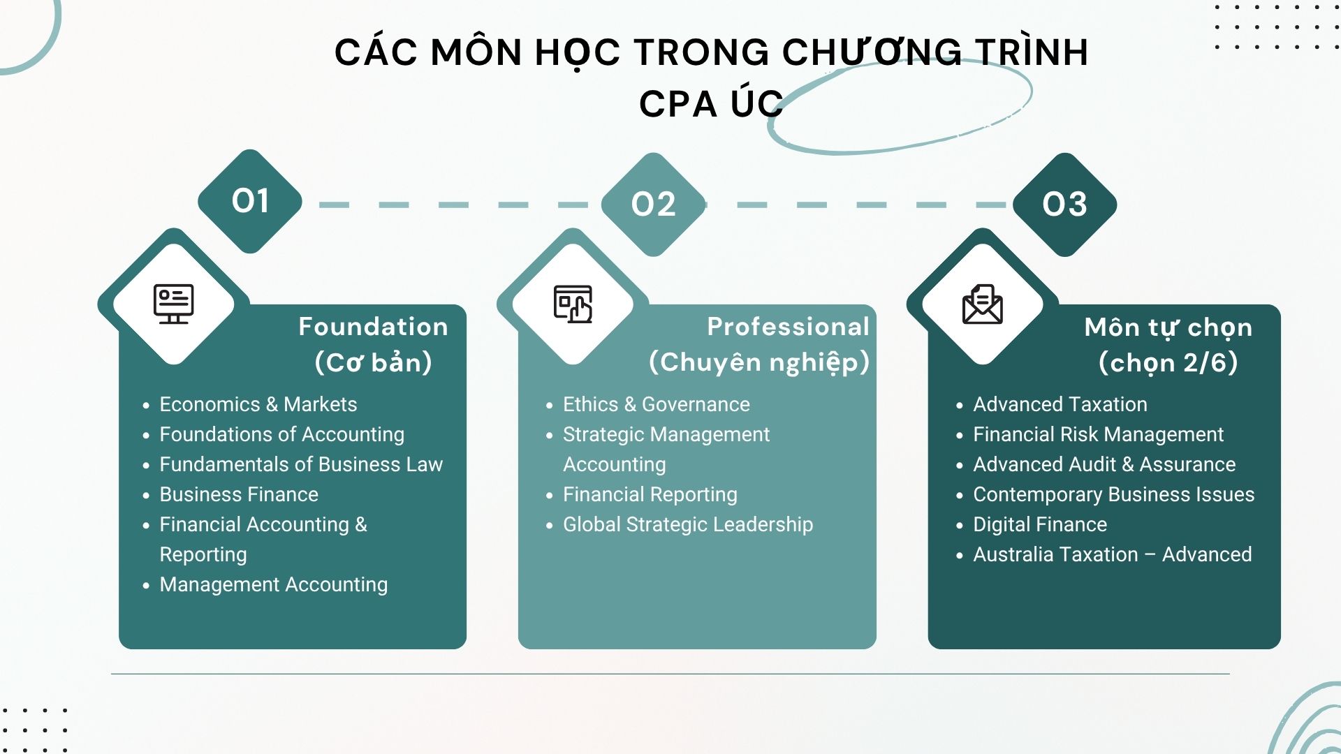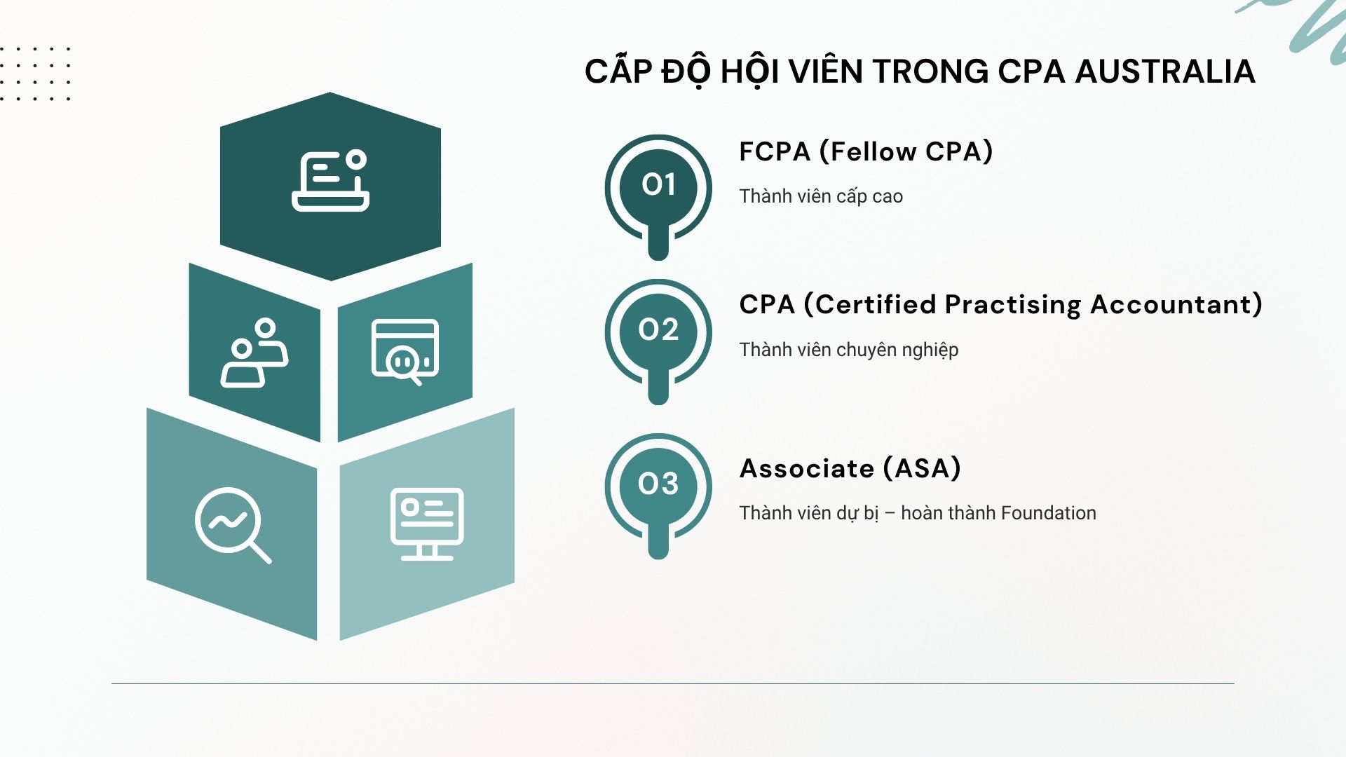 | CPA (Certified Practising Accountant) | Thành viên chuyên nghiệp | Hoàn tất chương trình CPA + 3 năm kinh nghiệm |