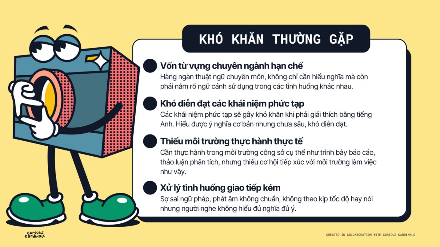 | Áp lực giao tiếp thực tế | Lo sợ sai ngữ pháp, phát âm, hoặc không theo kịp tốc độ nói trong các cuộc họp với chuyên gia nước ngoài. |