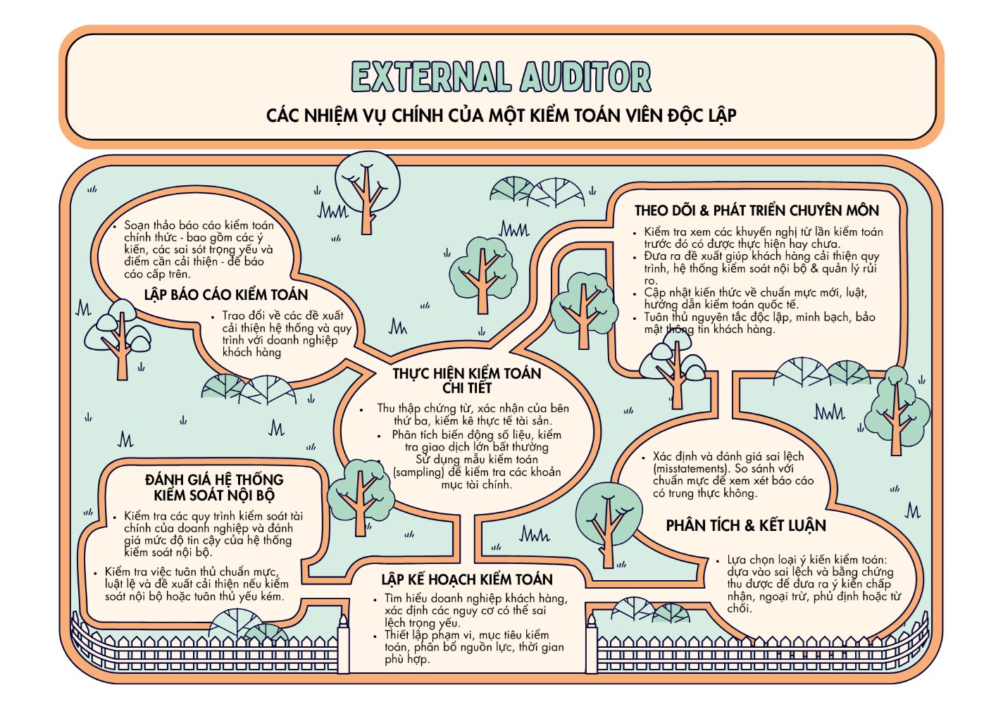 Kiểm toán viên độc lập (External Auditor) là người kiểm tra báo cáo tài chính, hệ thống kiểm soát nội bộ và các giao dịch của doanh nghiệp để đưa ra ý kiến khách quan về tính trung thực, hợp lý của báo cáo theo chuẩn mực kế toán và kiểm toán. Họ làm việc từ bên ngoài doanh nghiệp, không thuộc bộ máy nội bộ, vì vậy phải luôn giữ sự độc lập và không bị chi phối bởi khách hàng.
