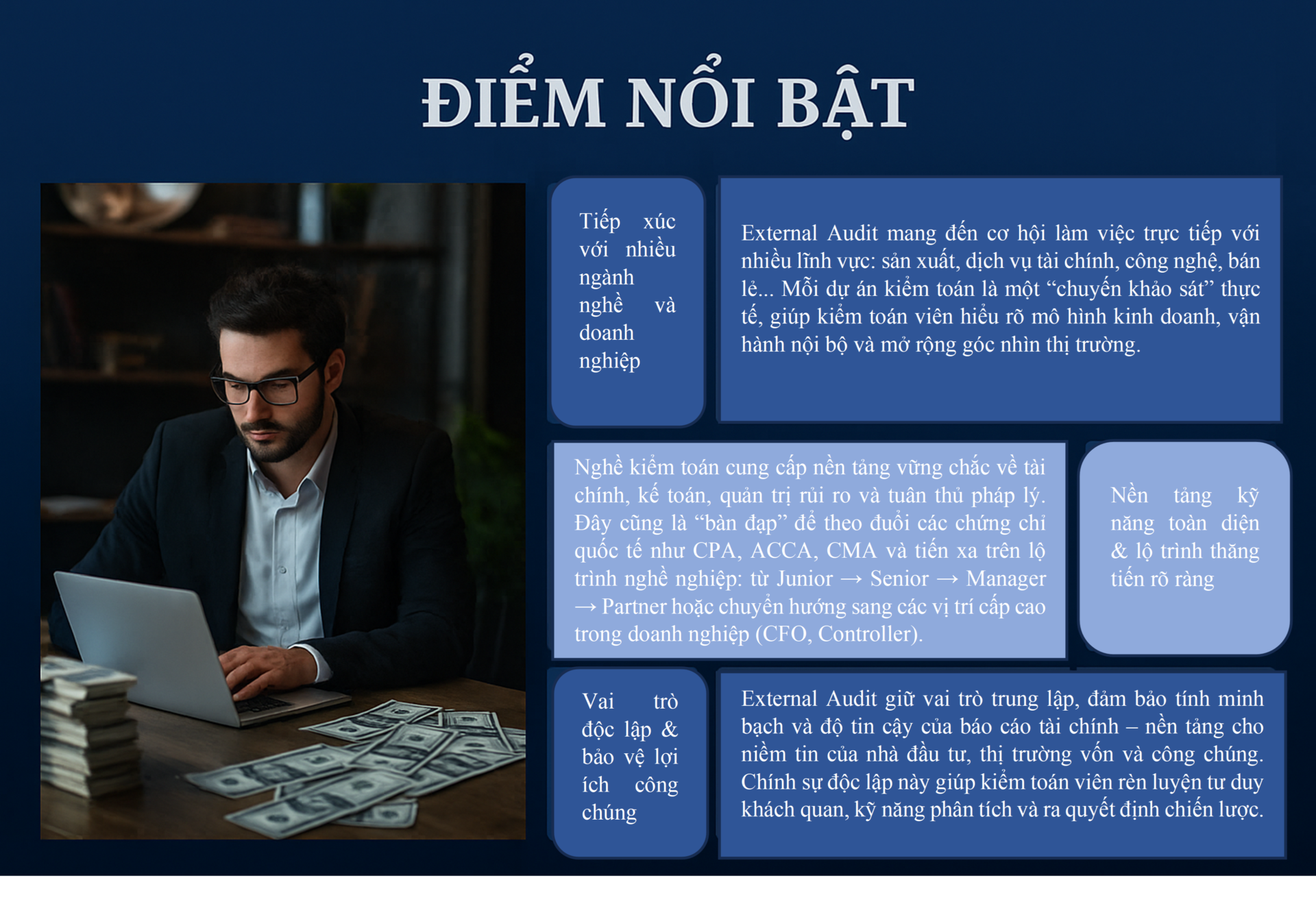 Lộ trình sự nghiệp của một External Auditor là hành trình đầy thử thách nhưng cũng vô cùng giàu giá trị. Bạn bắt đầu từ vị trí thực tập sinh hoặc trợ lý kiểm toán, làm quen với hồ sơ khách hàng, học cách thu thập dữ liệu và nắm quy trình cơ bản. Khi trở thành Staff Auditor, bạn bắt đầu trực tiếp “chạm tay” vào công việc kiểm toán, đối chiếu từng con số, phân tích chứng từ để đảm bảo tính chính xác. Ở vị trí Senior Auditor, bạn không chỉ vững vàng về chuyên môn mà còn dẫn dắt nhóm nhỏ, trở thành cầu nối quan trọng với khách hàng. Cấp độ Manager đánh dấu bước ngoặt: bạn quản lý hợp đồng kiểm toán, điều phối đội ngũ và chịu trách nhiệm về chất lượng báo cáo. Tiến xa hơn, Senior Manager/Director là người lãnh đạo nhiều dự án lớn, xây dựng chiến lược khách hàng và phát triển đội ngũ kế thừa. Và cuối cùng, đỉnh cao của sự nghiệp chính là Partner – người ký báo cáo kiểm toán, hoạch định chiến lược và góp phần xây dựng thương hiệu, uy tín cho cả công ty. Đây không chỉ là một lộ trình nghề nghiệp, mà còn là hành trình khẳng định bản thân, tích lũy uy tín và tạo dấu ấn bền vững trong thế giới tài chính – kiểm toán.