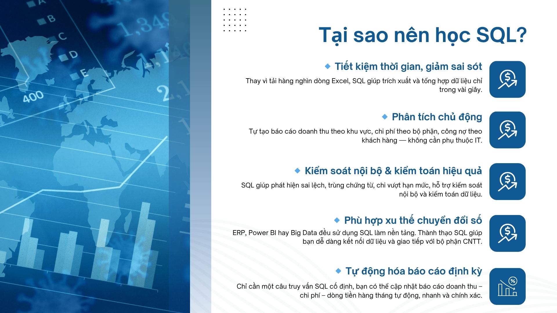 Thành thạo SQL, bạn không chỉ là kế toán viên nhập liệu, mà là chuyên gia hiểu dữ liệu – phân tích dữ liệu – và ra quyết định dựa trên dữ liệu.