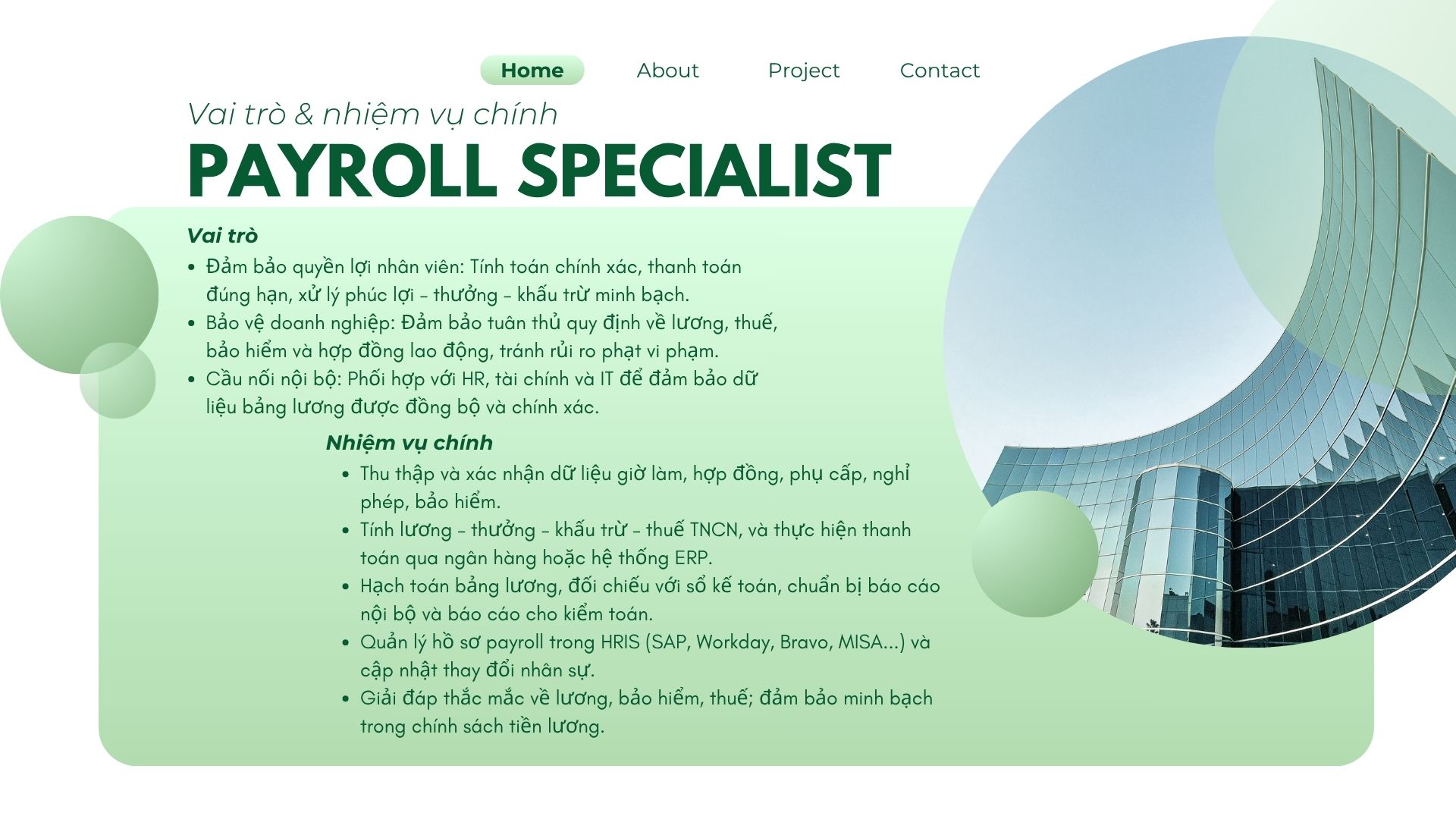 | Payroll Specialist / Executive | Quản lý toàn bộ quy trình tính lương – thuế – bảo hiểm – báo cáo. | Độc lập xử lý và kiểm soát dữ liệu payroll. |