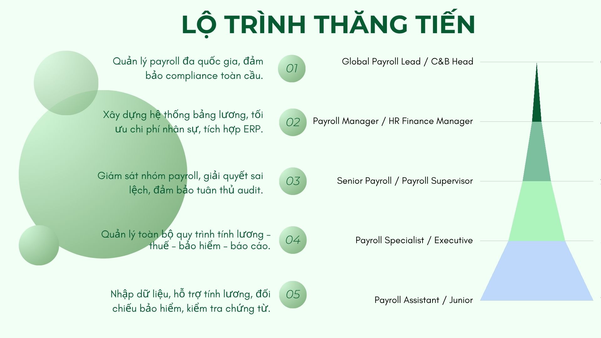 | Global Payroll Lead / C&B Head | Quản lý payroll đa quốc gia, đảm bảo compliance toàn cầu. | Đỉnh cao nghề nghiệp, quản trị chi phí nhân sự chiến lược. |