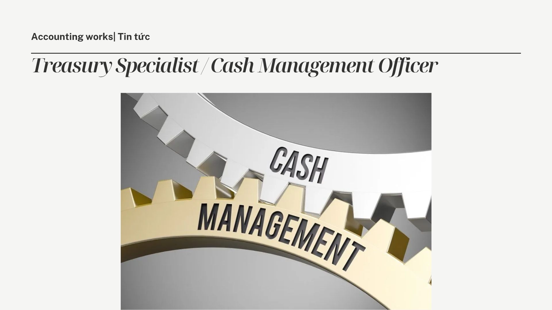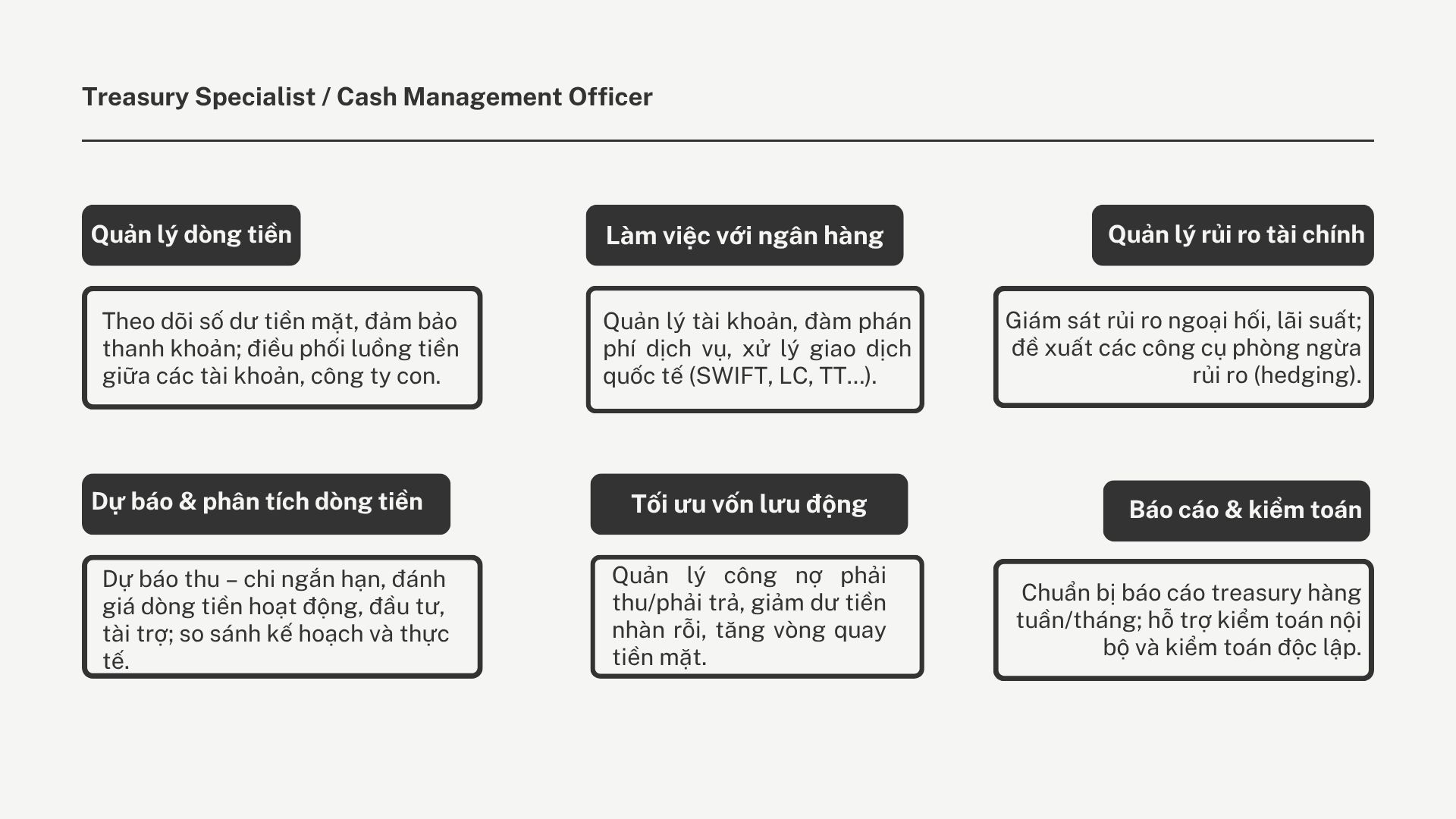 Vai trò Treasury Specialist / Cash Management Officer thường được gộp chung với phòng Tài chính – Kế toán.